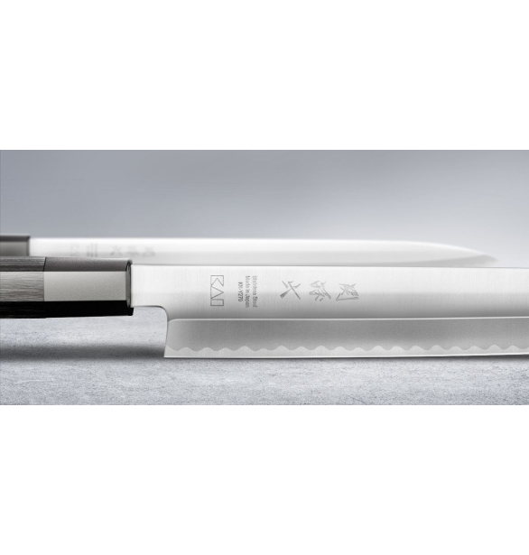 La forma del ganivet, extremadament llarg i estret, permet fer corts molt fines i precisos - perfectes per a tallar peix. La fulla d'un sol tall dels Yanagiba està feta amb acer inoxidable amb alt contingut de carboni, que satisfarà els estàndards més exigents. A més, està decorada amb una lleugera i elegant ona setinada. La nova sèrie KK combina qualitat i robusteza amb una funcionalitat senzilla i còmoda.