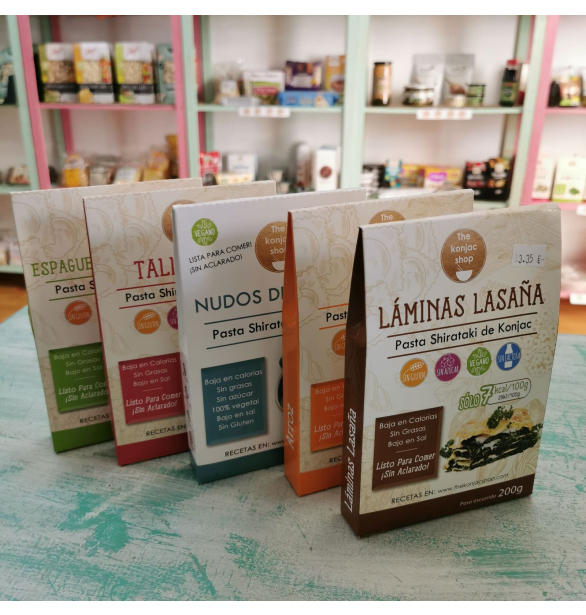 Pasta Shirataki de Konjac, tallarines, espaguetis, láminas de lasaña, arroz, nudos.